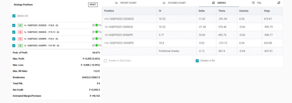 This approach—combining the option chain structure, robust risk/reward, and the Greeks—provides strong, time-decay-driven returns so long as Nifty remains within the broad 24,433–25,067 range until the 16th September expiry. Adjust promptly if a volatility spike or directional move occurs, but under these market conditions, it offers a statistically favourable edge