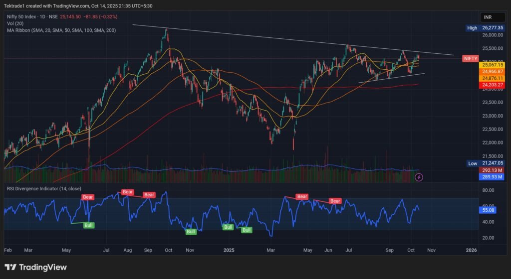 The Nifty index closed the day at 25,145.50 with a moderate decline of 81.85 points, following a volatile expiry session. Here’s a comprehensive perspective combining technical chart signals and key option chain cues for trading on 15 October.